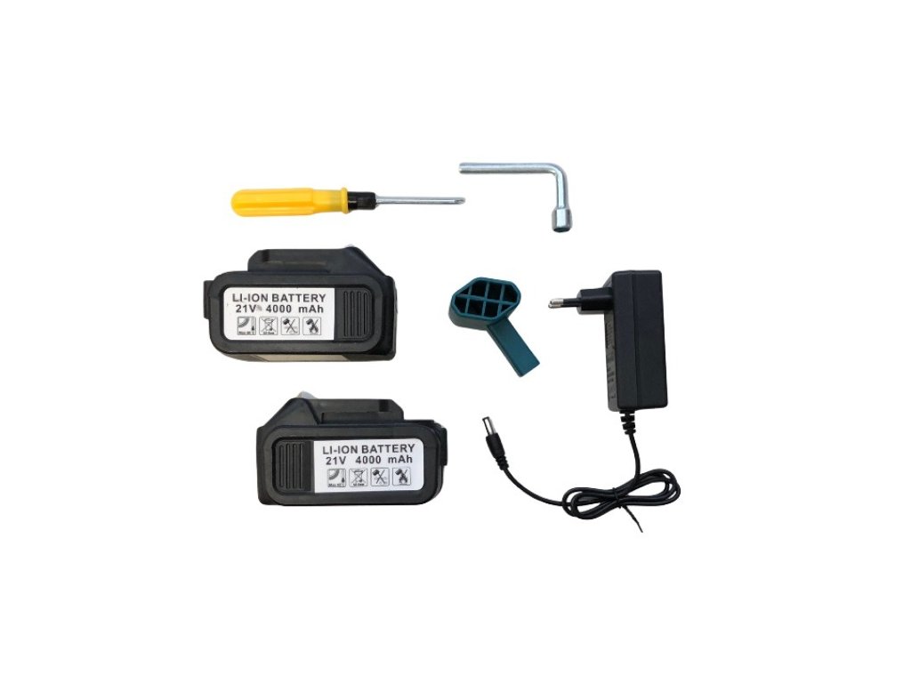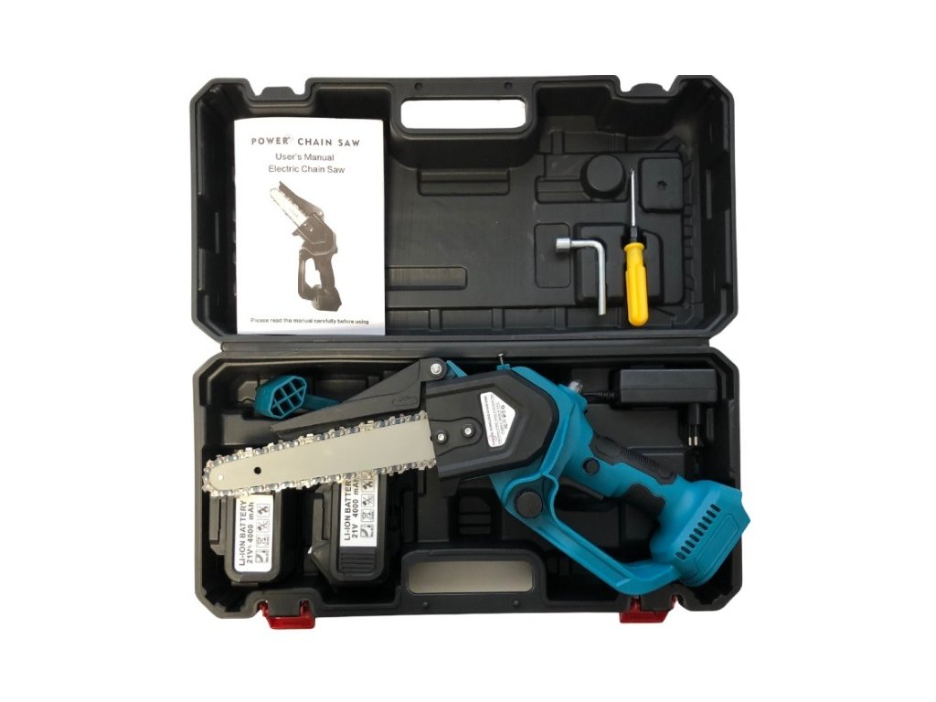 Balení obsahuje: AKU mini pilku (1200 W), 6" lištu + řetěz, 2x 21V baterii, nabíječku, šroubovák, klíč a praktický kufřík.